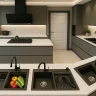 - Gömme çöp kutuları veya geri dönüşüm üniteleri, tezgahın hemen yanında konumlanabilir.